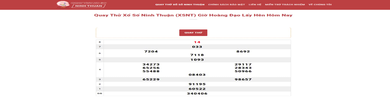 Quay Thử Xổ Số Ninh Thuận là tiện ích quay thử XSNT giờ hoàng đạo miễn phí, hỗ trợ người chơi lấy hên và tìm ra những con số có xác suất về cao nhất trong ngày của đài xổ số kiến thiết Ninh Thuận.